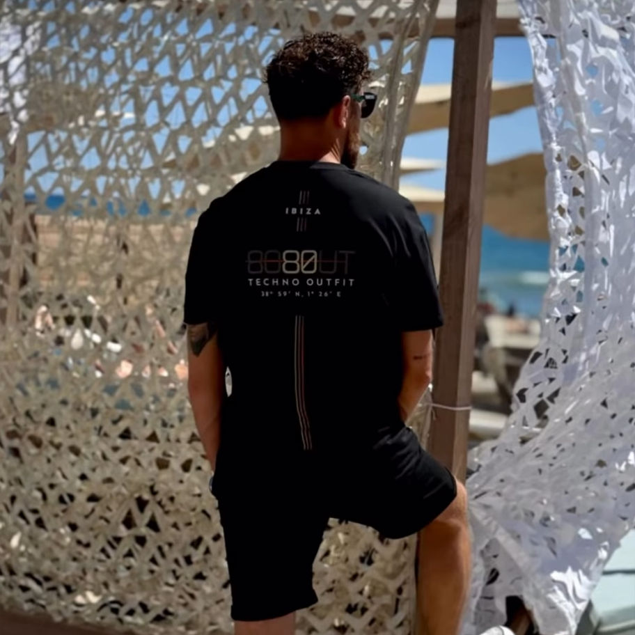 Black T-shirt with our logo on heart. Logo on the back with geographic coordinates of the city of Boom and 3 colored lines.